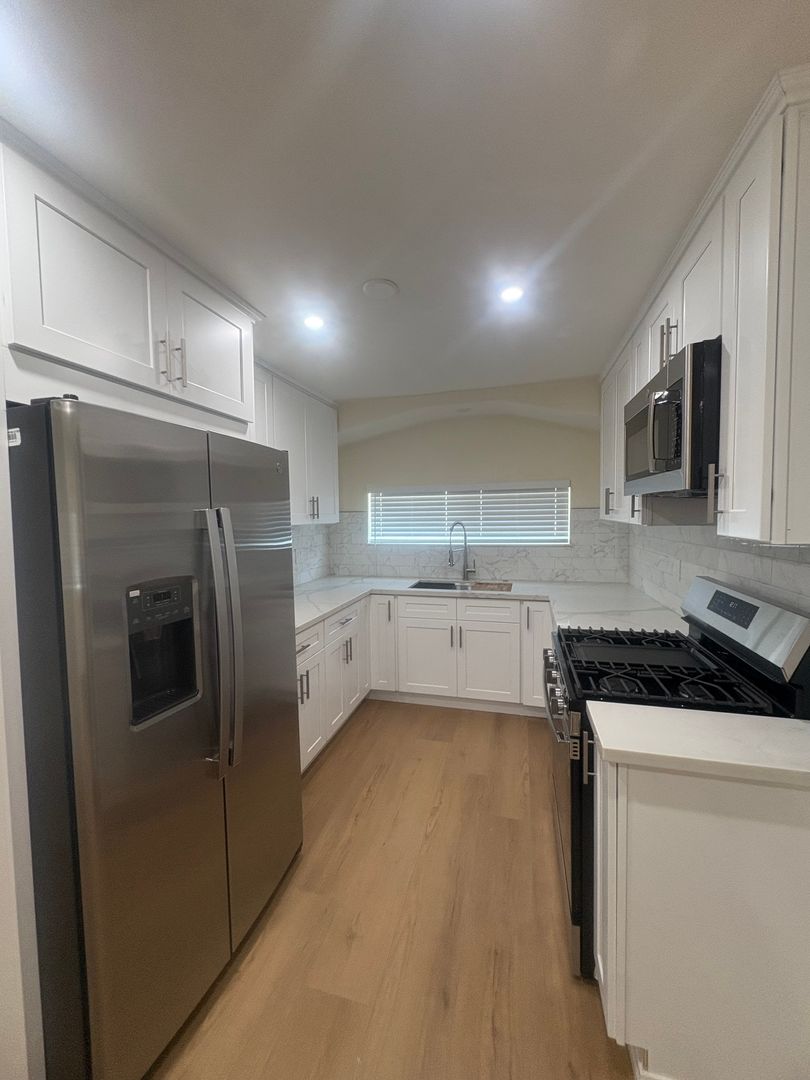 Beautifully remodeled, spacious, single story, three bedroom, one bathroom updated home with Quartz countertops in the kitchen and shaker cabinets. New wood-like vinyl flooring throughout and neutral paint. New gas range, microwave, and fridge included. Off street parking for two cars. Laundry room on site. No pets. No smoking. Trash included, tenant responsible for all other utilities. Available now!
