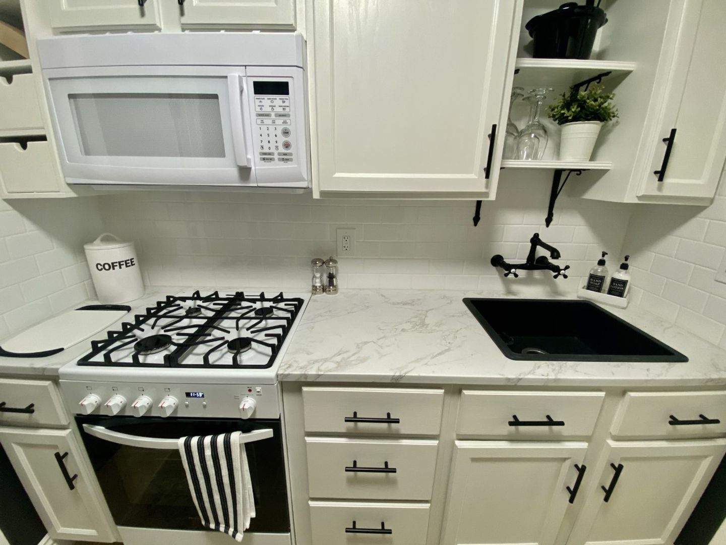 Kitchen includes shaker cabinets, gas range, microwave, and refrigerator.